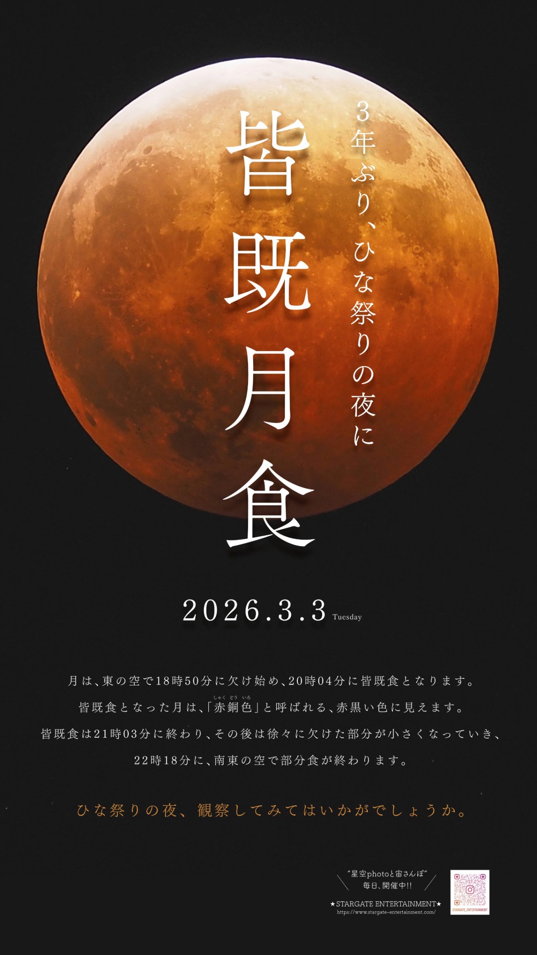 皆既食となった月は、「赤銅色(しゃくどういろ)」と呼ばれる、赤黒い色に見えます。